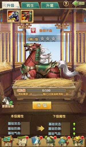 坐騎的升級是掛機(jī)式的玩法,只要飼料充足,養(yǎng)在馬廄中的坐騎就會(huì)隨時(shí)間得到經(jīng)驗(yàn)。前面也提到了,當(dāng)升級到一定級數(shù),坐騎必須轉(zhuǎn)生才可繼續(xù)獲得經(jīng)驗(yàn)升級。而坐騎的轉(zhuǎn)生,需要消耗同等級的坐騎作為材料。因此,當(dāng)陣上的坐騎已經(jīng)滿級,需要轉(zhuǎn)生的時(shí)候,掌門可以將馬廄的位置用于升級材料馬,這樣才能最大化的提升坐騎的等級。