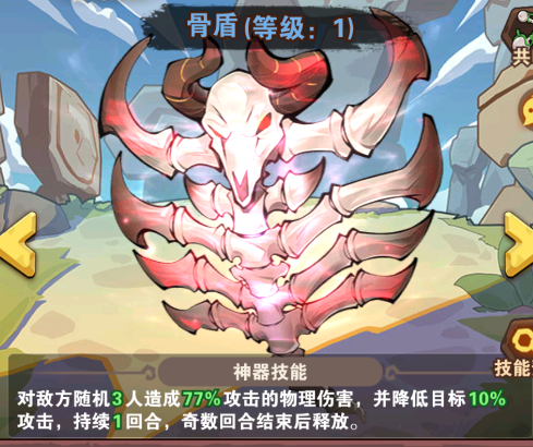 骨盾:對敵方隨機(jī)3人造成77%攻擊的物理傷害,并降低目標(biāo)10%攻擊,持續(xù)1回合,奇數(shù)回合結(jié)束后釋放。