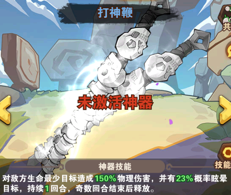 打神鞭:對敵方生命最少目標(biāo)造成150%物理傷害,并有23%概率眩暈?zāi)繕?biāo),持續(xù)1回合,奇數(shù)回合結(jié)束后釋放。