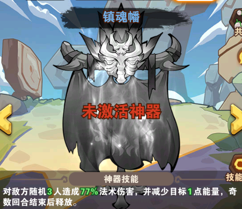 鎮(zhèn)魂幡:對敵方隨機(jī)3人造成77%法術(shù)傷害,并減少目標(biāo)1點(diǎn)能量奇數(shù)回合結(jié)束后釋放。