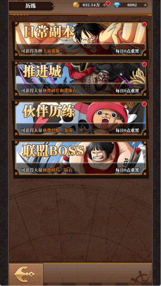 本游戲有非常多有意思的副本玩法,在推進(jìn)城中首通層數(shù)可獲得大量伙伴碎片和進(jìn)階石,掃蕩可獲得大量貝里和突破卡?;锇闅v練中可以可獲得大量伙伴經(jīng)驗、金幣。強(qiáng)者降臨:挑戰(zhàn)boss可以獲得鉆石、進(jìn)階石和貝利。更有多種玩法,獲取豐富資源。還有更多副本玩法等你來發(fā)現(xiàn)!