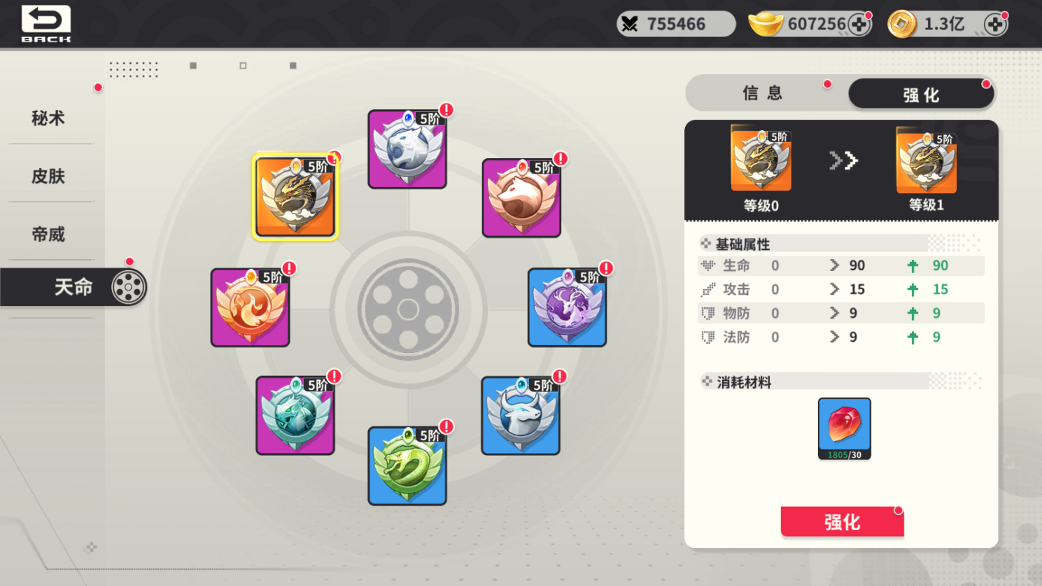 玩家可以通過打造材料獲得對應(yīng)天命,同時可以裝備天命來提升數(shù)值。天命采用換代形式,不同等級裝備的天命階數(shù)是不一樣的。同時天命可以進(jìn)行強化和突破,提升天命屬性。