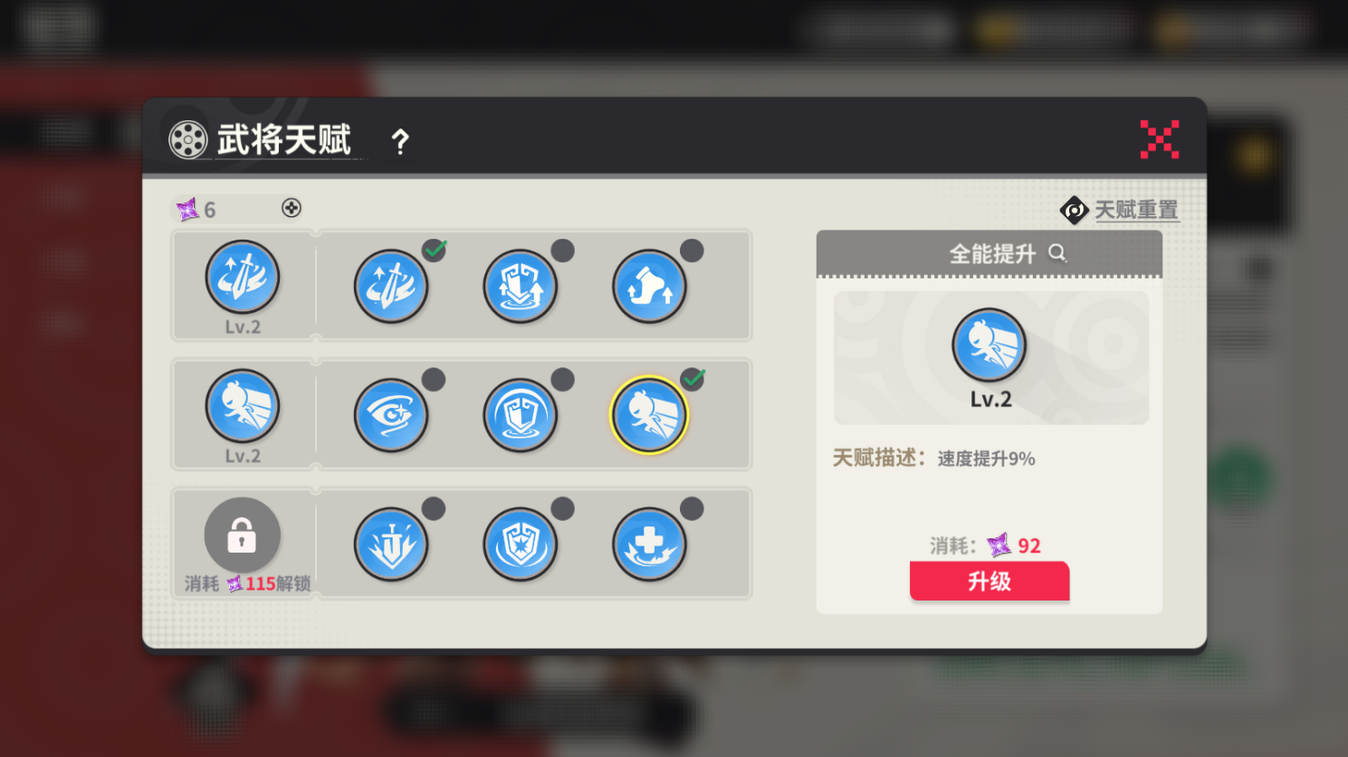 只有指定擁有武將天賦,根據(jù)武將星級(jí)解鎖武將天賦階級(jí);每個(gè)天賦階級(jí)擁有3個(gè)技能,通過(guò)消耗道具提升天賦技能等級(jí);天賦等級(jí)越高,增加的技能效果,技能屬性越高。