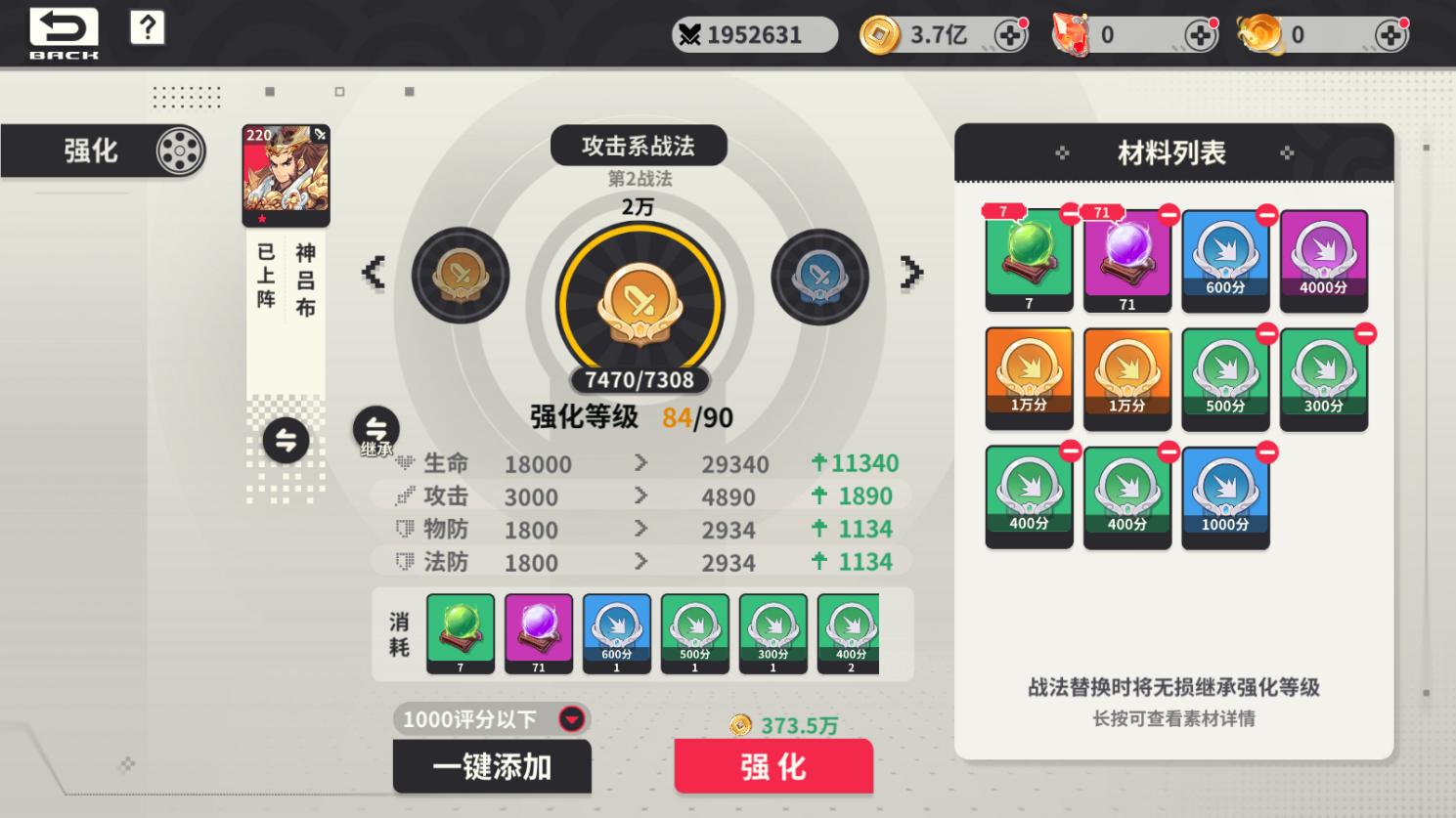 武將技能需要領(lǐng)悟戰(zhàn)法后激活,不同類(lèi)型武將需要使用對(duì)應(yīng)的戰(zhàn)法類(lèi)型,戰(zhàn)法可培養(yǎng)升級(jí),升級(jí)增加戰(zhàn)法基礎(chǔ)屬性;戰(zhàn)法評(píng)分大于或等于五萬(wàn)分可傳承。