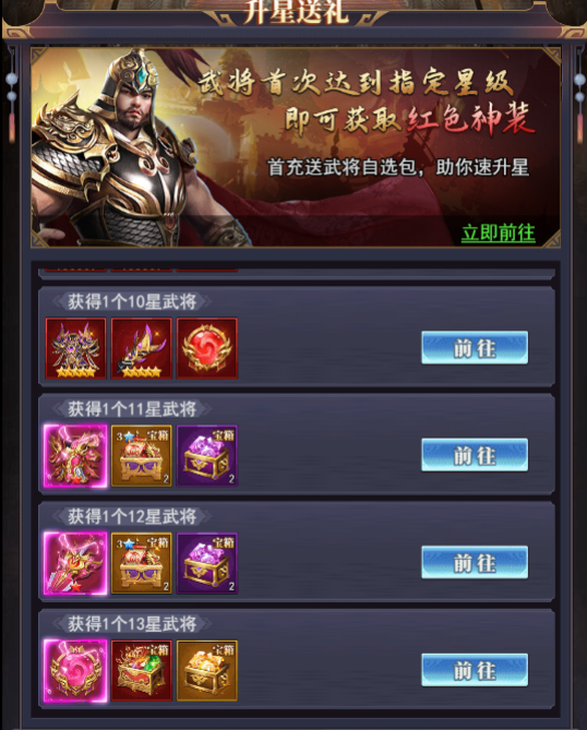 4、武將升星,免費(fèi)領(lǐng)取紅色神裝和粉色時裝等大量稀有道具豪禮