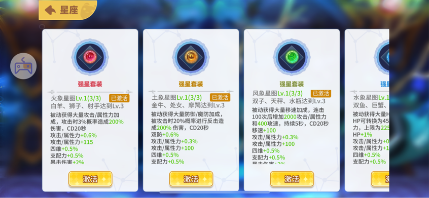 同時星座玩法還有星圖一個很重要的提升方面。每個象限的三個星座同時達到3級,6級,9級,12級,15級,18級,21級,24級,27級,30級后可以激活獲得額外屬性加成。